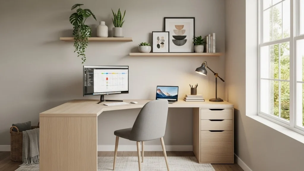 Searches like small home office decor ideas, decorating small home office ideas, and interior decorating ideas for home office show people struggle with space. The fix? Go vertical and keep it simple.