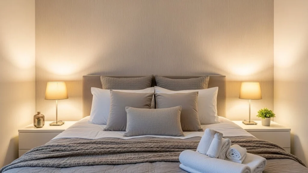 Stick to calm tones, hidden storage, and hotel-style bedding.